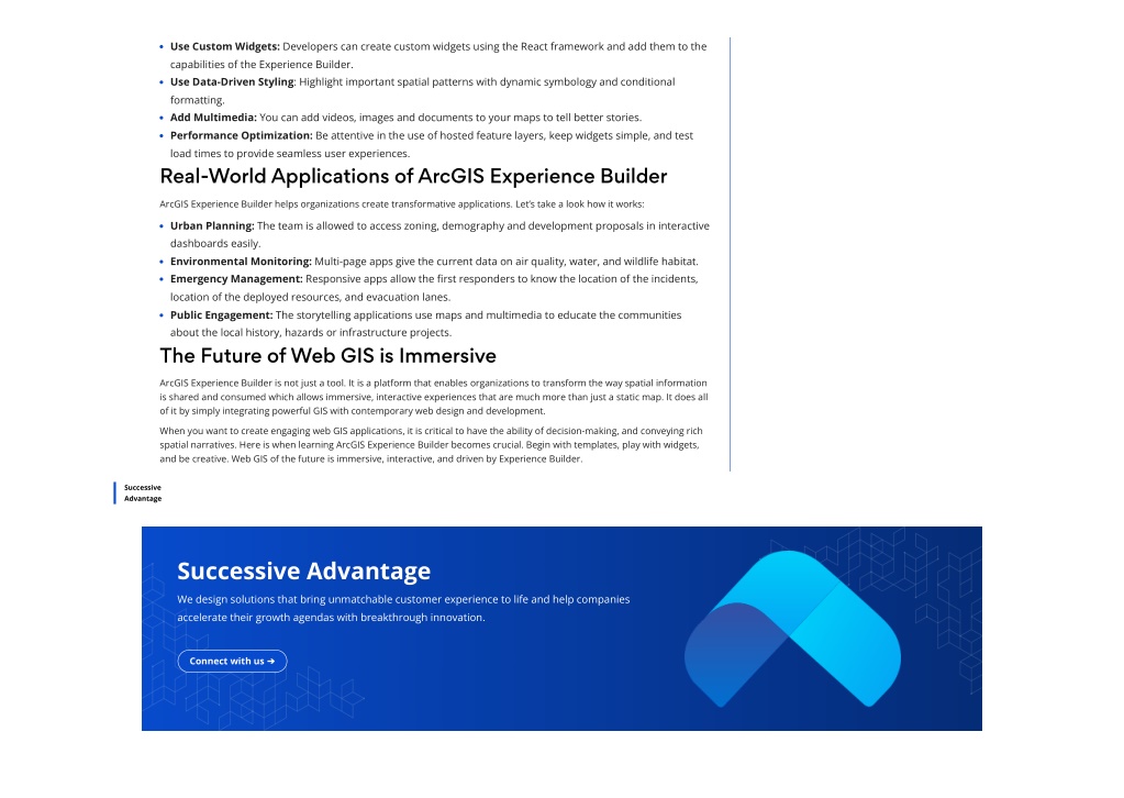Use Custom Widgets: Developers can create custom widgets using the React framework and add them to the capabilities of the Experience Builder. Use Data-Driven Styling: Highlight important spatial patterns with dynamic symbology and conditional formatting. Add Multimedia: You can add videos, images and documents to your maps to tell better stories. Performance Optimization: Be attentive in the use of hosted feature layers, keep widgets simple, and test load times to provide seamless user experiences. Real-World Applications of ArcGIS Experience Builder ArcGIS Experience Builder helps organizations create transformative applications. Let’s take a look how it works: Urban Planning: The team is allowed to access zoning, demography and development proposals in interactive dashboards easily. Environmental Monitoring: Multi-page apps give the current data on air quality, water, and wildlife habitat. Emergency Management: Responsive apps allow the ?rst responders to know the location of the incidents, location of the deployed resources, and evacuation lanes. Public Engagement: The storytelling applications use maps and multimedia to educate the communities about the local history, hazards or infrastructure projects. The Future of Web GIS is Immersive ArcGIS Experience Builder is not just a tool. It is a platform that enables organizations to transform the way spatial information is shared and consumed which allows immersive, interactive experiences that are much more than just a static map. It does all of it by simply integrating powerful GIS with contemporary web design and development. When you want to create engaging web GIS applications, it is critical to have the ability of decision-making, and conveying rich spatial narratives. Here is when learning ArcGIS Experience Builder becomes crucial. Begin with templates, play with widgets, and be creative. Web GIS of the future is immersive, interactive, and driven by Experience Builder. Successive Advantage Successive Advantage We design solutions that bring unmatchable customer experience to life and help companies accelerate their growth agendas with breakthrough innovation. Connect with us ➔