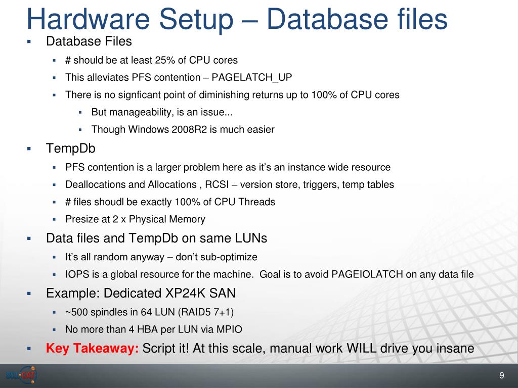 Hardware Setup – Database files • Database Files • # should be at least 25% of CPU cores • This alleviates PFS contention – PAGELATCH_UP • There is no signficant point of diminishing returns up to 100% of CPU cores • But manageability, is an issue... • Though Windows 2008R2 is much easier • TempDb • PFS contention is a larger problem here as it’s an instance wide resource • Deallocations and Allocations , RCSI – version store, triggers, temp tables • # files shoudl be exactly 100% of CPU Threads • Presize at 2 x Physical Memory • Data files and TempDb on same LUNs • It’s all random anyway – don’t sub-optimize • IOPS is a global resource for the machine. Goal is to avoid PAGEIOLATCH on any data file • Example: Dedicated XP24K SAN • ~500 spindles in 64 LUN (RAID5 7+1) • No more than 4 HBA per LUN via MPIO • Key Takeaway: Script it! At this scale, manual work WILL drive you insane