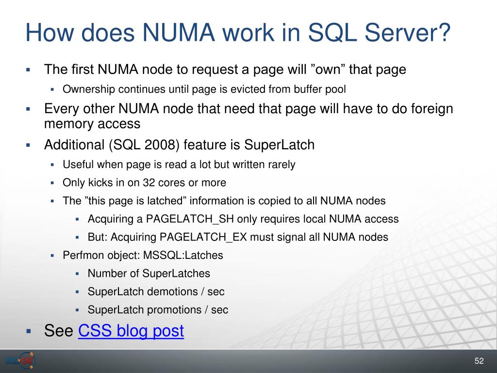 How does NUMA work in SQL Server? • The first NUMA node to request a page will ”own” that page • Ownership continues until page is evicted from buffer pool • Every other NUMA node that need that page will have to do foreign memory access • Additional (SQL 2008) feature is SuperLatch • Useful when page is read a lot but written rarely • Only kicks in on 32 cores or more • The ”this page is latched” information is copied to all NUMA nodes • Acquiring a PAGELATCH_SH only requires local NUMA access • But: Acquiring PAGELATCH_EX must signal all NUMA nodes • Perfmon object: MSSQL:Latches • Number of SuperLatches • SuperLatch demotions / sec • SuperLatch promotions / sec • See CSS blog post