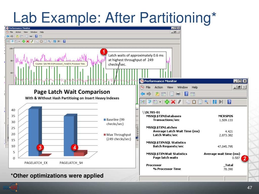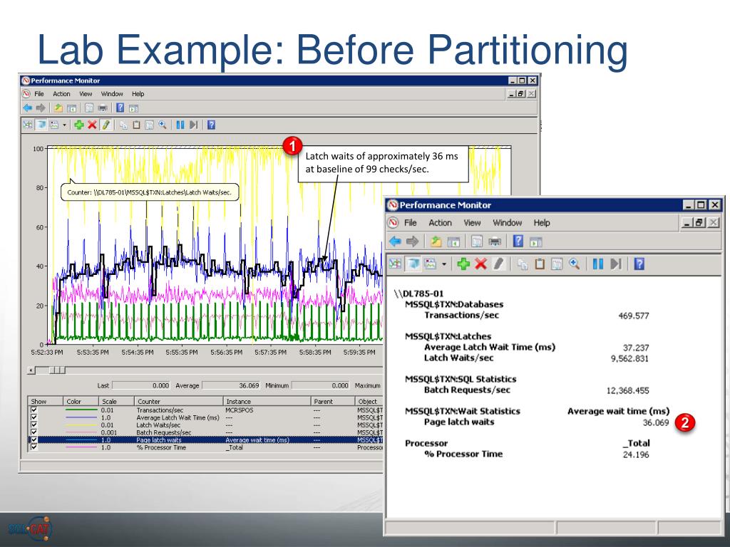 Lab Example: Before Partitioning 1 Latch waits of approximately 36 ms at baseline of 99 checks/sec. 2