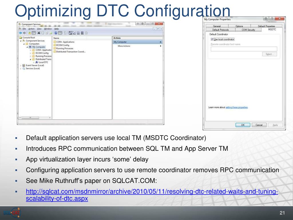 Optimizing DTC Configuration • Default application servers use local TM (MSDTC Coordinator) • Introduces RPC communication between SQL TM and App Server TM • App virtualization layer incurs ‘some’ delay • Configuring application servers to use remote coordinator removes RPC communication • See Mike Ruthruff’s paper on SQLCAT.COM: • http://sqlcat.com/msdnmirror/archive/2010/05/11/resolving-dtc-related-waits-and-tuning-scalability-of-dtc.aspx