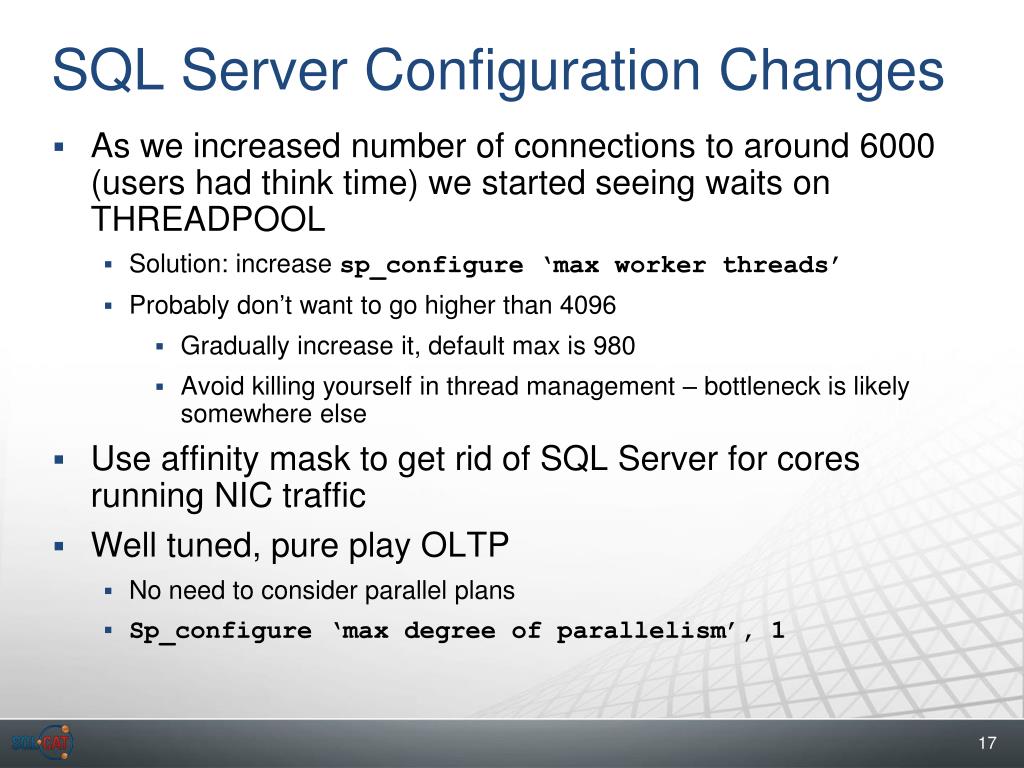 SQL Server Configuration Changes • As we increased number of connections to around 6000 (users had think time) we started seeing waits on THREADPOOL • Solution: increase sp_configure ‘max worker threads’ • Probably don’t want to go higher than 4096 • Gradually increase it, default max is 980 • Avoid killing yourself in thread management – bottleneck is likely somewhere else • Use affinity mask to get rid of SQL Server for cores running NIC traffic • Well tuned, pure play OLTP • No need to consider parallel plans • Sp_configure ‘max degree of parallelism’, 1