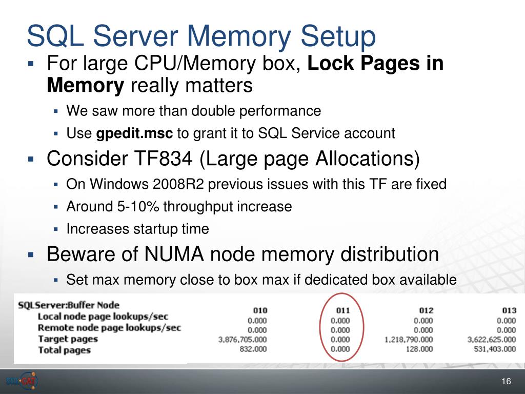 SQL Server Memory Setup • For large CPU/Memory box, Lock Pages in Memory really matters • We saw more than double performance • Use gpedit.mscto grant it to SQL Service account • Consider TF834 (Large page Allocations) • On Windows 2008R2 previous issues with this TF are fixed • Around 5-10% throughput increase • Increases startup time • Beware of NUMA node memory distribution • Set max memory close to box max if dedicated box available