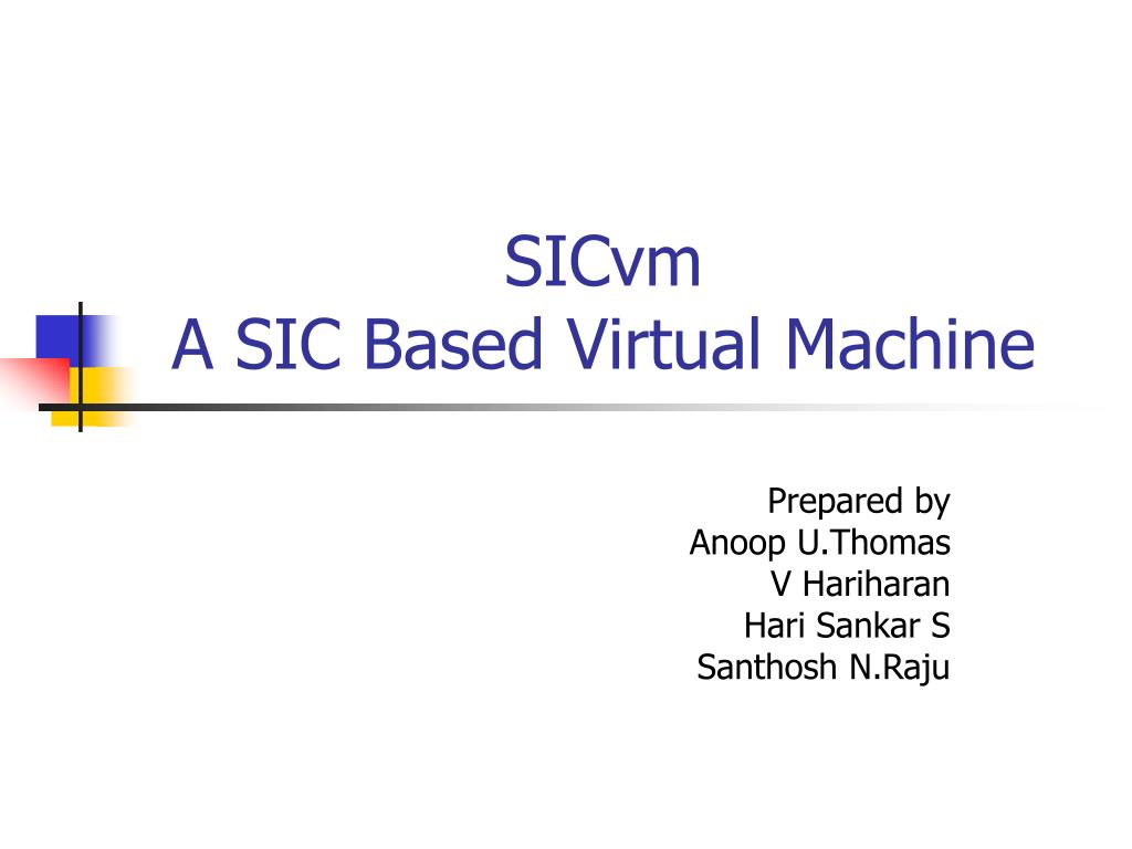 SICvm A SIC Based Virtual Machine. Prepared by Anoop U.Thomas V Hariharan Hari Sankar S Santhosh N.Raju. Introduction. In this project we aim to develop a Virtual Machine