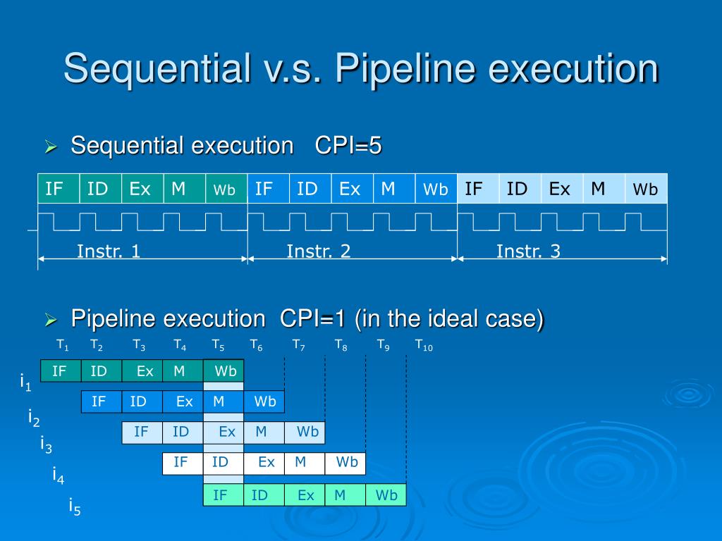 IF ID Ex M Wb IF ID Ex M Wb IF ID Ex M Wb Instr. 1 Instr. 2 Instr. 3 Sequential v.s. Pipeline execution • Sequential execution CPI=5 • Pipeline execution CPI=1 (in the ideal case) T1 T2 T3 T4 T5 T6 T7 T8 T9 T10 i1 IF ID Ex M Wb IF ID Ex M Wb i2 i3 IF ID Ex M Wb i4 IF ID Ex M Wb i5 IF ID Ex M Wb