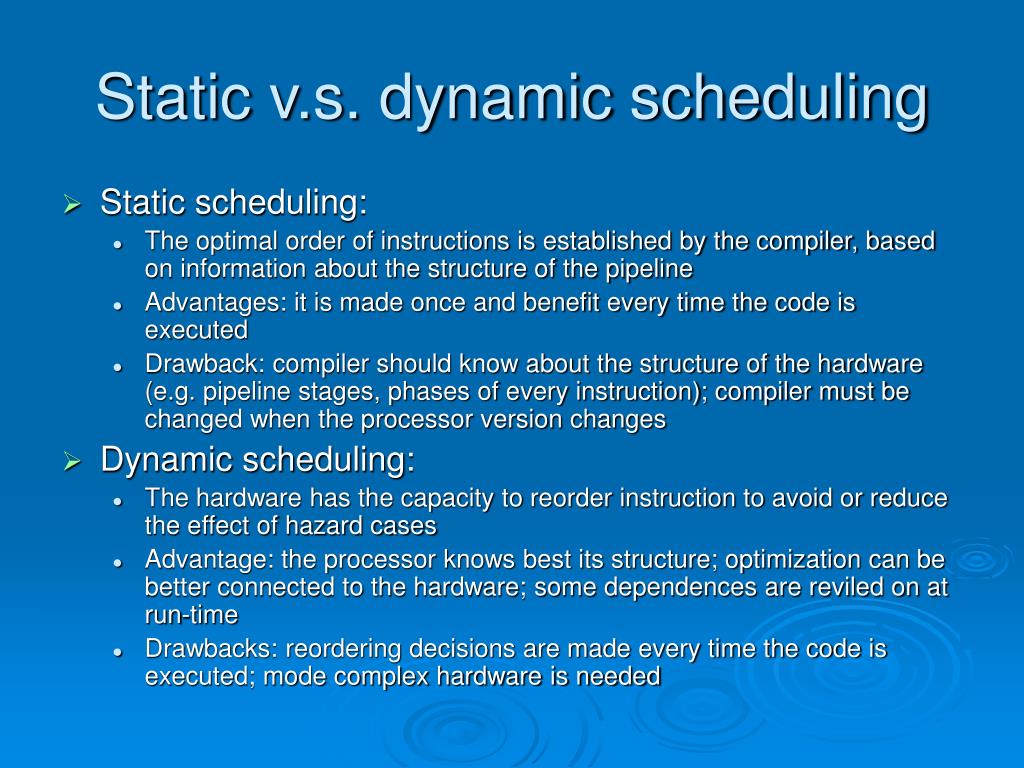 Static v.s. dynamic scheduling • Static scheduling: • The optimal order of instructions is established by the compiler, based on information about the structure of the pipeline • Advantages: it is made once and benefit every time the code is executed • Drawback: compiler should know about the structure of the hardware (e.g. pipeline stages, phases of every instruction); compiler must be changed when the processor version changes • Dynamic scheduling: • The hardware has the capacity to reorder instruction to avoid or reduce the effect of hazard cases • Advantage: the processor knows best its structure; optimization can be better connected to the hardware; some dependences are reviled on at run-time • Drawbacks: reordering decisions are made every time the code is executed; mode complex hardware is needed