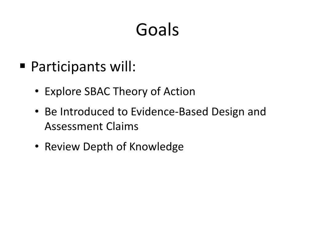 Goals • Participants will: • Explore SBAC Theory of Action • Be Introduced to Evidence-Based Design and Assessment Claims • Review Depth of Knowledge