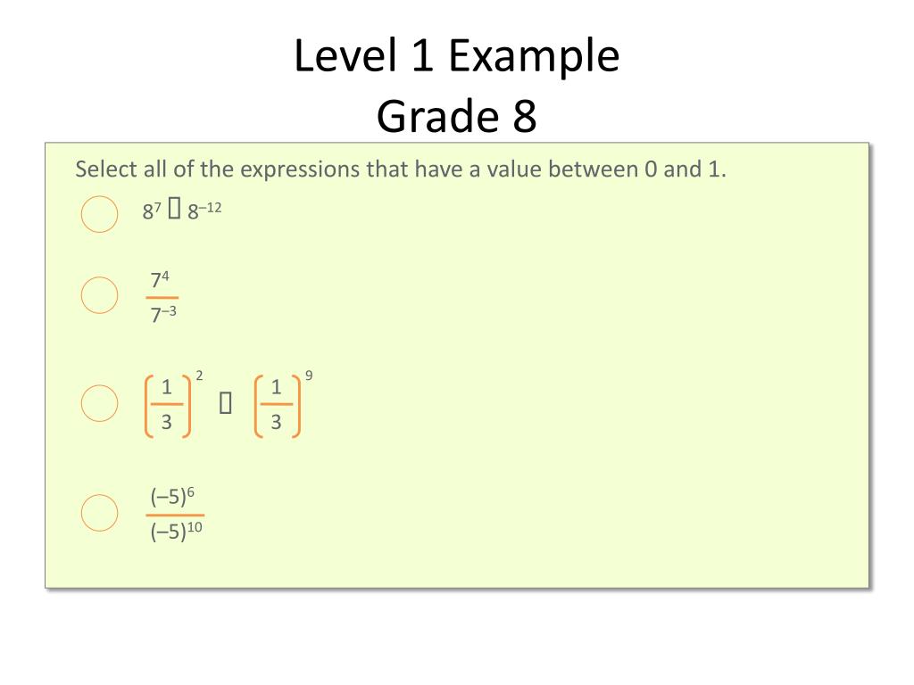 Level 1 ExampleGrade 8 Select all of the expressions that have a value between 0 and 1. 87∙ 8–12 74 7–3 ∙ 1 3 2 1 3 9 (–5)6 (–5)10