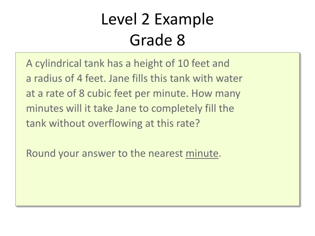 Level 2 ExampleGrade 8 A cylindrical tank has a height of 10 feet and a radius of 4 feet. Jane fills this tank with water at a rate of 8 cubic feet per minute. How many minutes will it take Jane to completely fill the tank without overflowing at this rate? Round your answer to the nearest minute.