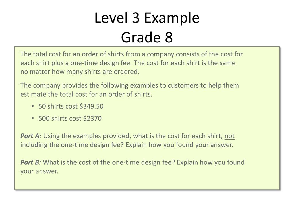 Level 3 ExampleGrade 8 • The total cost for an order of shirts from a company consists of the cost for each shirt plus a one-time design fee. The cost for each shirt is the same no matter how many shirts are ordered. • The company provides the following examples to customers to help them estimate the total cost for an order of shirts. • 50 shirts cost $349.50 • 500 shirts cost $2370 • Part A: Using the examples provided, what is the cost for each shirt, notincluding the one-time design fee? Explain how you found your answer. • Part B: What is the cost of the one-time design fee? Explain how you found your answer.