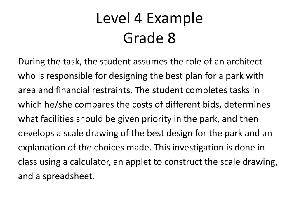 Level 4 ExampleGrade 8 During the task, the student assumes the role of an architect who is responsible for designing the best plan for a park with area and financial restraints. The student completes tasks in which he/she compares the costs of different bids, determines what facilities should be given priority in the park, and then develops a scale drawing of the best design for the park and an explanation of the choices made. This investigation is done in class using a calculator, an applet to construct the scale drawing, and a spreadsheet.