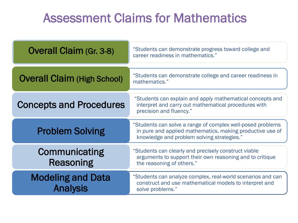“Students can demonstrate progress toward college and career readiness in mathematics.” Assessment Claims for Mathematics • “Students can demonstrate college and career readiness in mathematics.” Overall Claim (Gr. 3-8) • “Students can explain and apply mathematical concepts and interpret and carry out mathematical procedures with precision and fluency.” Overall Claim (High School) • “Students can solve a range of complex well-posed problems in pure and applied mathematics, making productive use of knowledge and problem solving strategies.” Concepts and Procedures • “Students can clearly and precisely construct viable arguments to support their own reasoning and to critique the reasoning of others.” Problem Solving • “Students can analyze complex, real-world scenarios and can construct and use mathematical models to interpret and solve problems.” Communicating Reasoning Modeling and Data Analysis