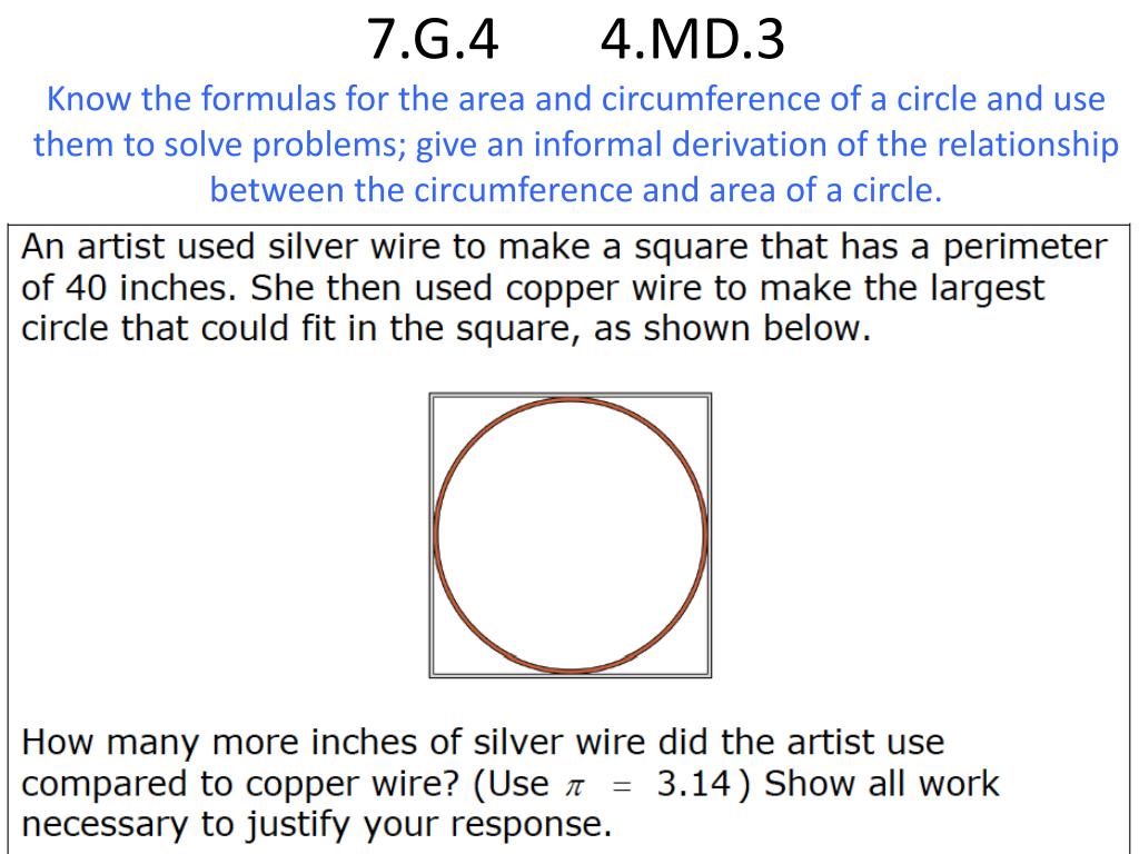 7.G.4 4.MD.3Know the formulas for the area and circumference of a circle and use them to solve problems; give an informal derivation of the relationship between the circumference and area of a circle.