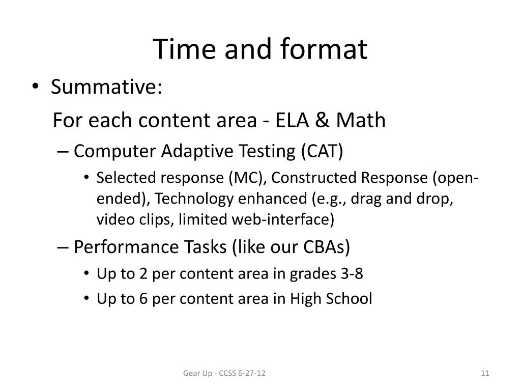 Time and format • Summative: For each content area - ELA & Math • Computer Adaptive Testing (CAT) • Selected response (MC), Constructed Response (open-ended), Technology enhanced (e.g., drag and drop, video clips, limited web-interface) • Performance Tasks (like our CBAs) • Up to 2 per content area in grades 3-8 • Up to 6 per content area in High School Gear Up - CCSS 6-27-12