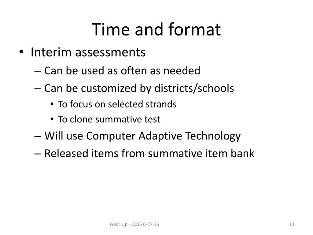 Time and format • Interim assessments • Can be used as often as needed • Can be customized by districts/schools • To focus on selected strands • To clone summative test • Will use Computer Adaptive Technology • Released items from summative item bank Gear Up - CCSS 6-27-12