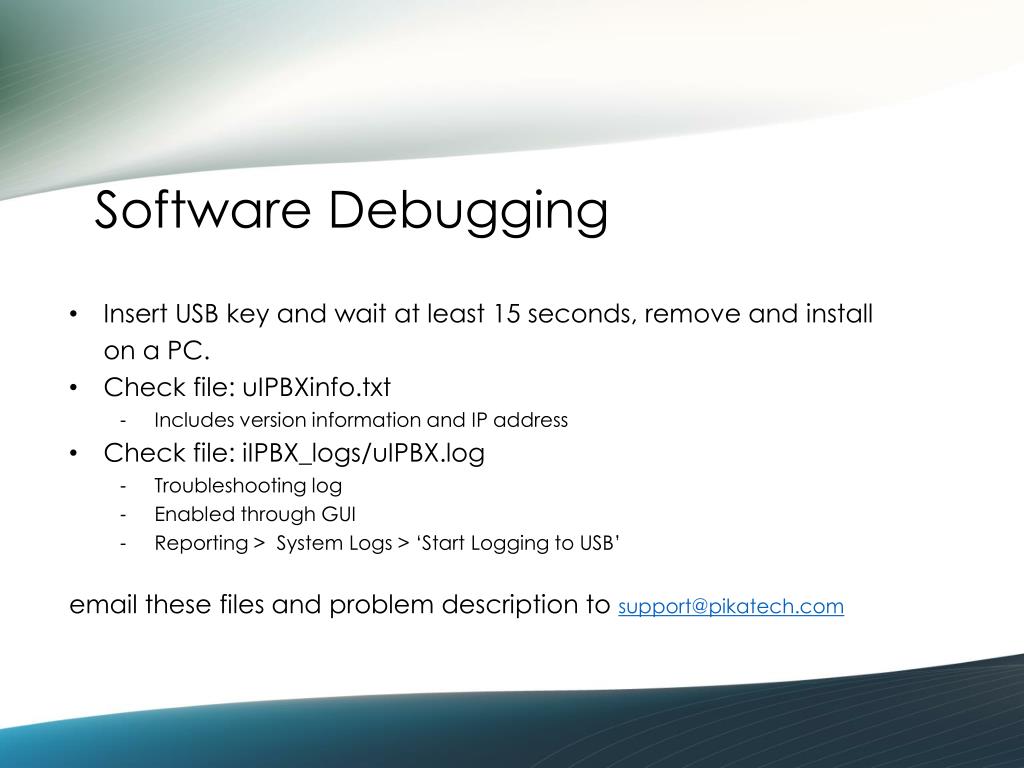 Software Debugging • Insert USB key and wait at least 15 seconds, remove and install on a PC. • Check file: uIPBXinfo.txt • Includes version information and IP address • Check file: iIPBX_logs/uIPBX.log • Troubleshooting log • Enabled through GUI • Reporting > System Logs > ‘Start Logging to USB’ • email these files and problem description to support@pikatech.com