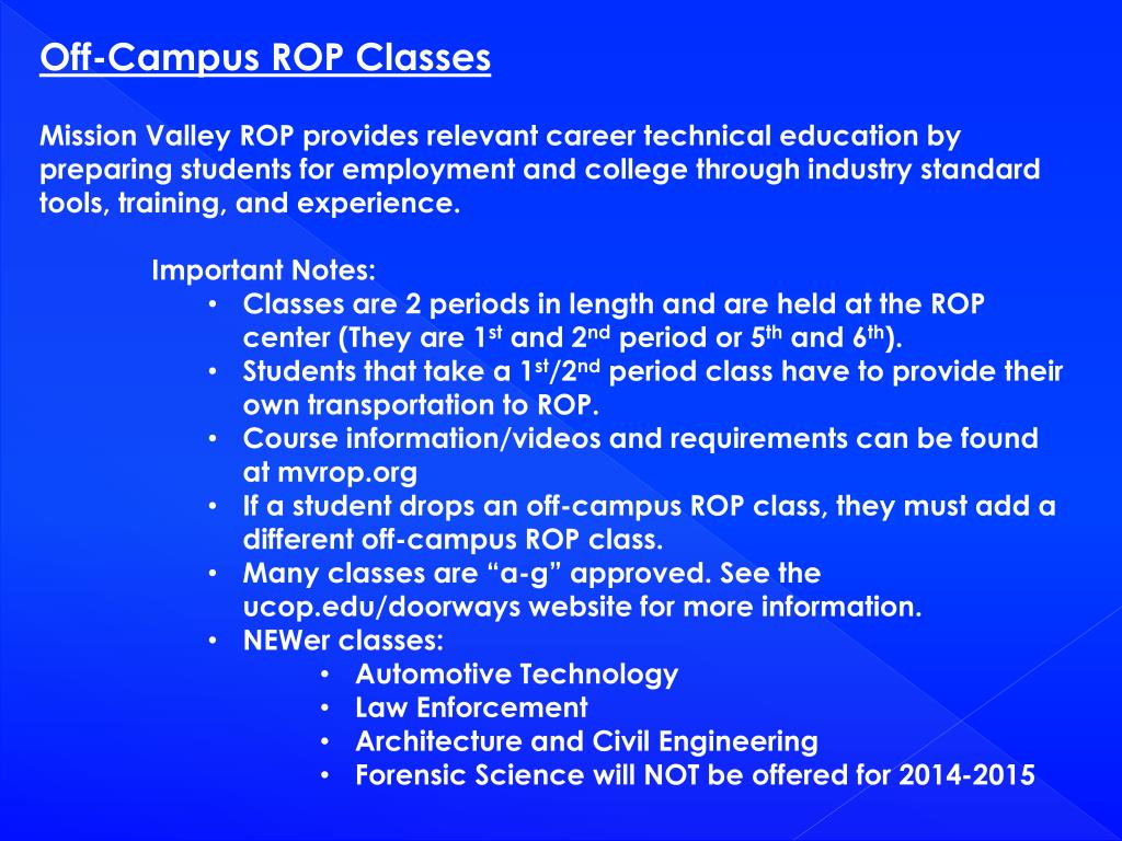 Off-Campus ROP Classes • Mission Valley ROP provides relevant career technical education by preparing students for employment and college through industry standard tools, training, and experience. • Important Notes: • Classes are 2 periods in length and are held at the ROP center (They are 1st and 2nd period or 5th and 6th). • Students that take a 1st/2nd period class have to provide their own transportation to ROP. • Course information/videos and requirements can be found at mvrop.org • If a student drops an off-campus ROP class, they must add a different off-campus ROP class. • Many classes are “a-g” approved. See the ucop.edu/doorways website for more information. • NEWer classes: • Automotive Technology • Law Enforcement • Architecture and Civil Engineering • Forensic Science will NOT be offered for 2014-2015