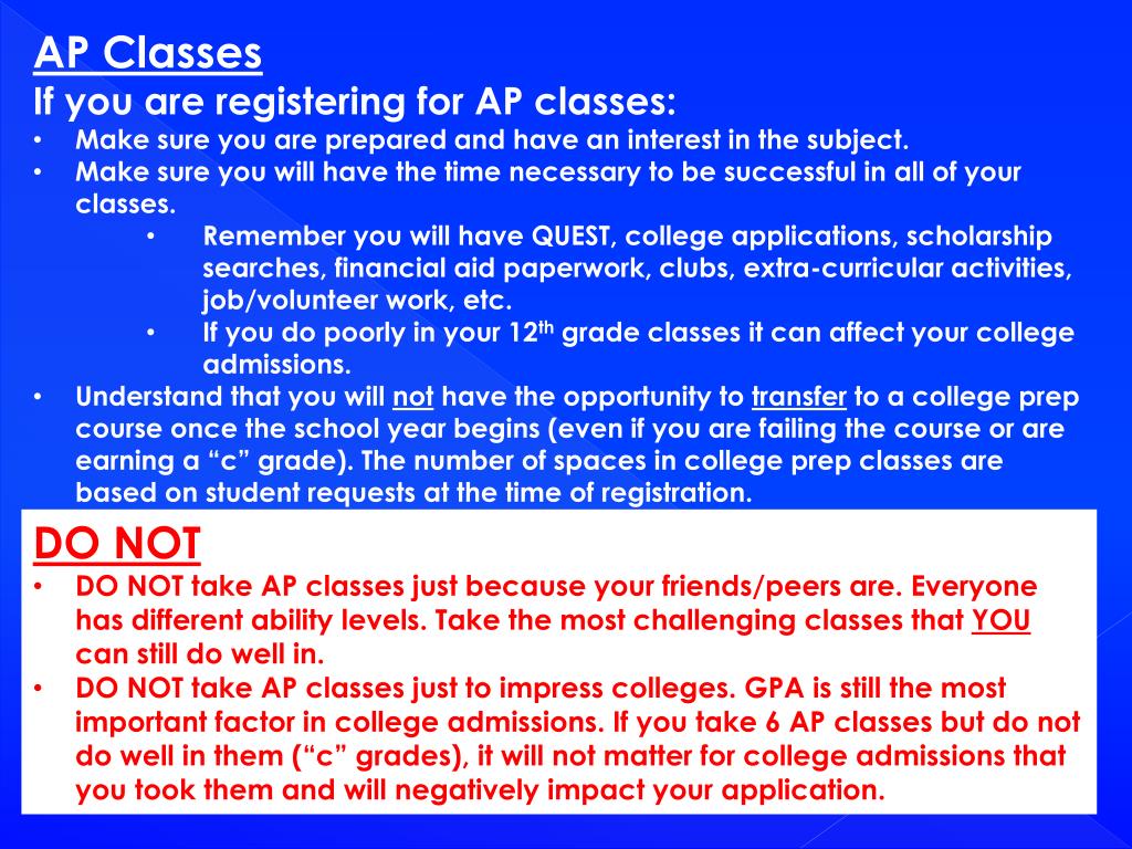 AP Classes • If you are registering for AP classes: • Make sure you are prepared and have an interest in the subject. • Make sure you will have the time necessary to be successful in all of your classes. • Remember you will have QUEST, college applications, scholarship searches, financial aid paperwork,clubs, extra-curricular activities, job/volunteer work, etc. • If you do poorly in your 12th grade classes it can affect your college admissions. • Understand that you will not have the opportunity to transfer to a college prep course once the school year begins (even if you are failing the course or are earning a “c” grade). The number of spaces in college prep classes are based on student requests at the time of registration. • DO NOT • DO NOT take AP classes just because your friends/peers are. Everyone has different ability levels. Take the most challenging classes that YOU can still do well in. • DO NOT take AP classes just to impress colleges. GPA is still the most important factor in college admissions. If you take 6 AP classes but do not do well in them (“c” grades), it will not matter for college admissions that you took them and will negatively impact your application.