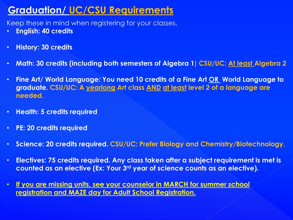 Graduation/ UC/CSU Requirements • Keep these in mind when registering for your classes. • English: 40 credits • History: 30 credits • Math: 30 credits (including both semesters of Algebra 1) CSU/UC: At least Algebra 2 • Fine Art/ World Language: You need 10 credits of a Fine Art OR World Language to graduate. CSU/UC: A yearlong Art class ANDat least level 2 of a language are needed. • Health: 5 credits required • PE: 20 credits required • Science: 20 credits required. CSU/UC: Prefer Biology and Chemistry/Biotechnology. • Electives: 75 credits required. Any class taken after a subject requirement is met is counted as an elective (Ex: Your 3rd year of science counts as an elective). • If you are missing units, see your counselor in MARCH for summer school registration and MAZE day for Adult School Registration.
