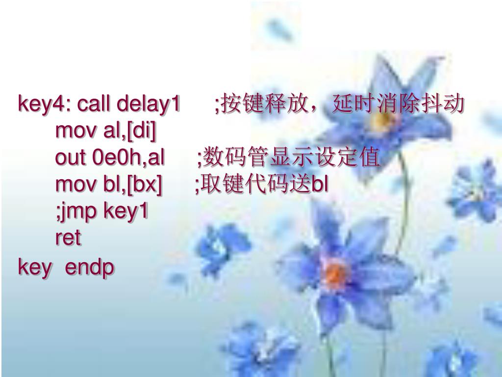 key4: call delay1 ;按键释放,延时消除抖动mov al,[di] out 0e0h,al ;数码管显示设定值mov bl,[bx] ;取键代码送bl ;jmp key1 retkey endp
