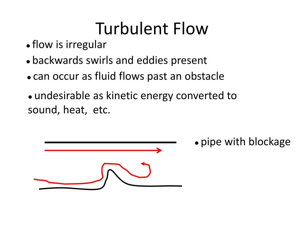 Turbulent Flow ● flow is irregular ● backwards swirls and eddies present ● can occur as fluid flows past an obstacle ● undesirable as kinetic energy converted to sound, heat, etc. ● pipe with blockage
