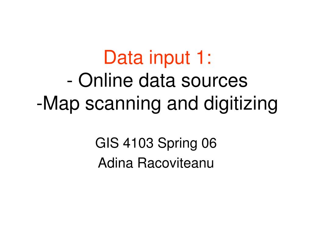 Data input 1: - Online data sources -Map scanning and digitizing . GIS 4103 Spring 06 Adina Racoviteanu. Data entry. = operation of encoding data for inclusion into a database - time-consuming part of GIS!. Methods of data entry. 1. transfer of data from existing digital sources