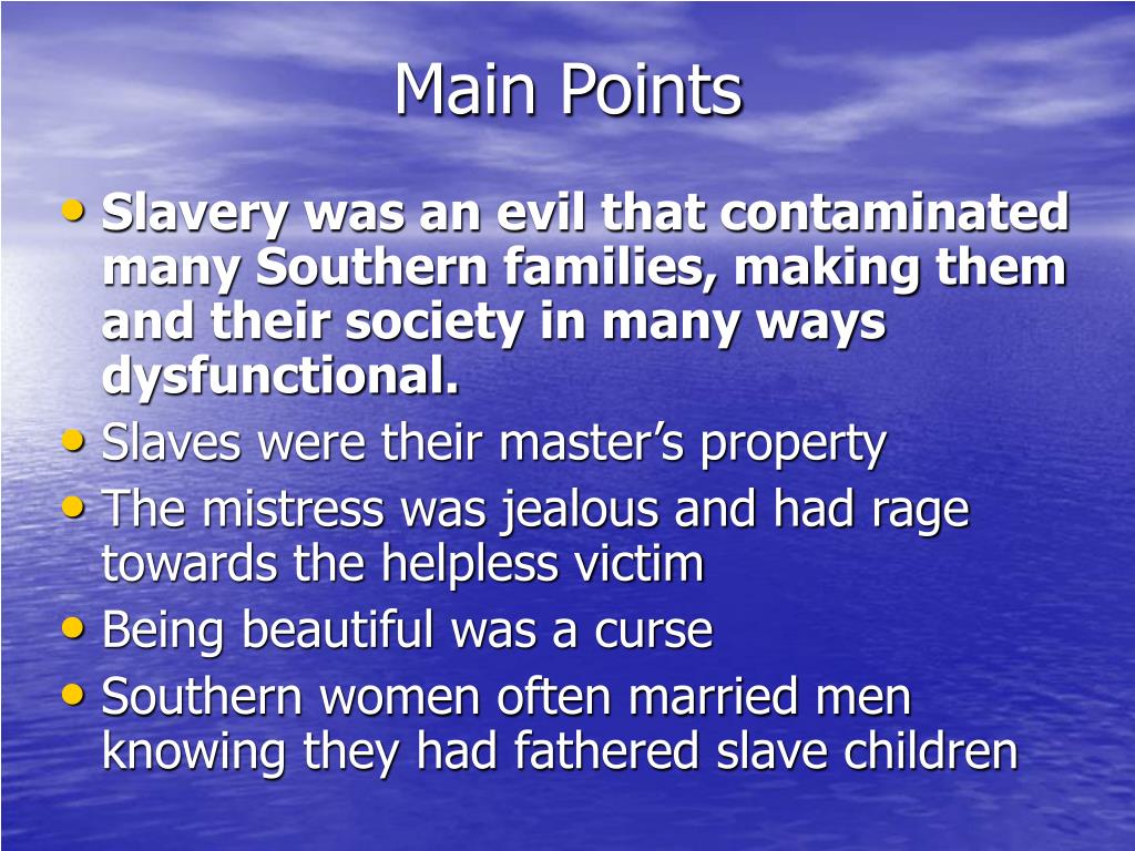 Main Points • Slavery was an evil that contaminated many Southern families, making them and their society in many ways dysfunctional. • Slaves were their master’s property • The mistress was jealous and had rage towards the helpless victim • Being beautiful was a curse • Southern women often married men knowing they had fathered slave children