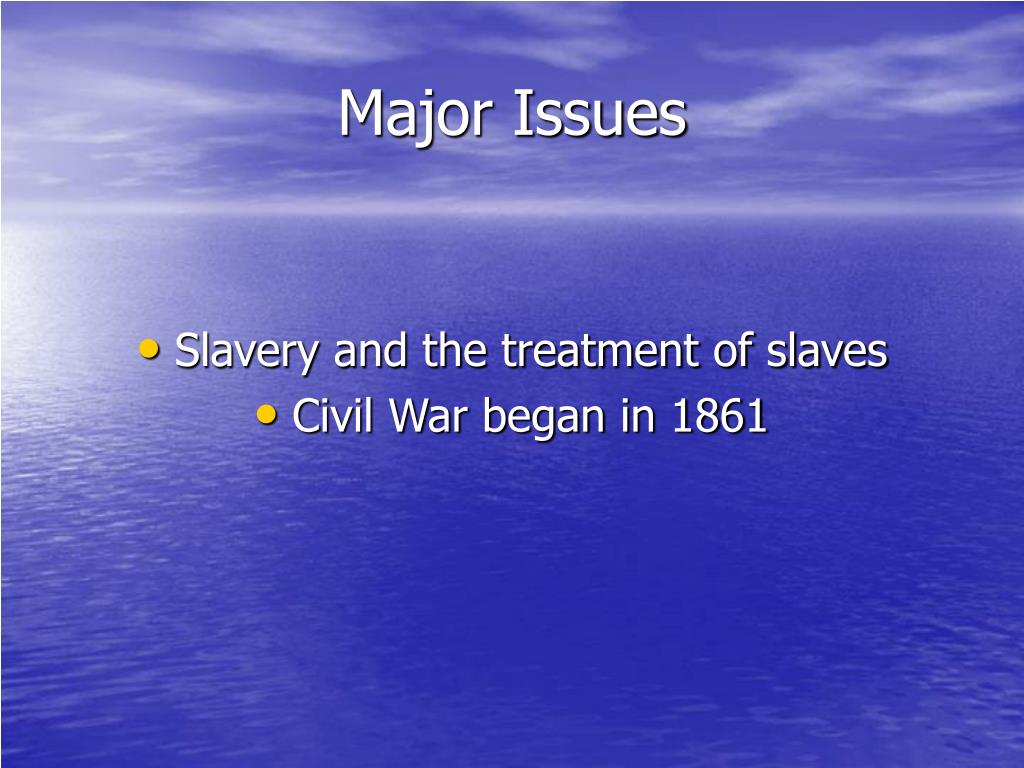 Major Issues • Slavery and the treatment of slaves • Civil War began in 1861