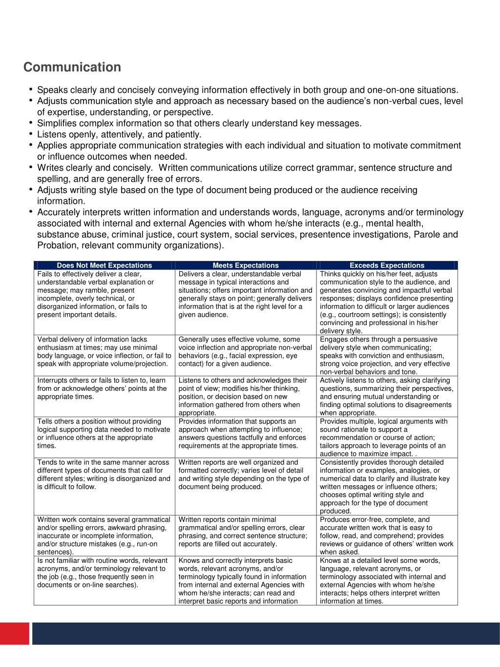 Communication • Speaks clearly and concisely conveying information effectively in both group and one-on-one situations. • Adjusts communication style and approach as necessary based on the audience’s non-verbal cues, level of expertise, understanding, or perspective. • Simplifies complex information so that others clearly understand key messages. • Listens openly, attentively, and patiently. • Applies appropriate communication strategies with each individual and situation to motivate commitment or influence outcomes when needed. • Writes clearly and concisely. Written communications utilize correct grammar, sentence structure and spelling, and are generally free of errors. • Adjusts writing style based on the type of document being produced or the audience receiving information. • Accurately interprets written information and understands words, language, acronyms and/or terminology associated with internal and external Agencies with whom he/she interacts (e.g., mental health, substance abuse, criminal justice, court system, social services, presentence investigations, Parole and Probation, relevant community organizations).