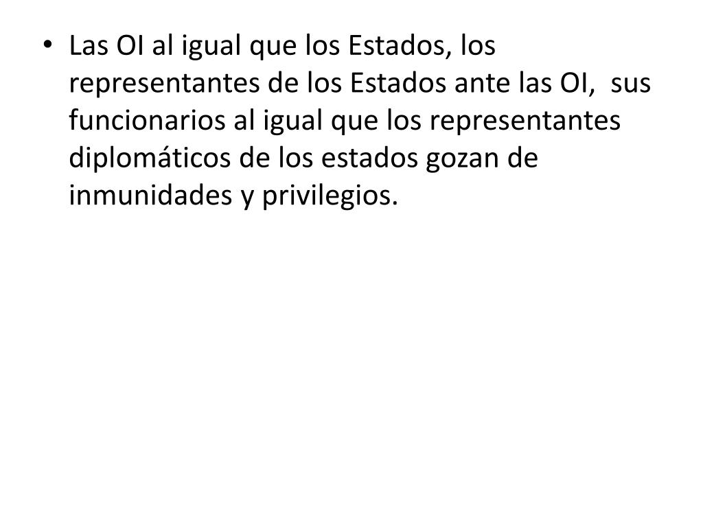 Las OI al igual que los Estados, los representantes de los Estados ante las OI, sus funcionarios al igual que los representantes diplomáticos de los estados gozan de inmunidades y privilegios.
