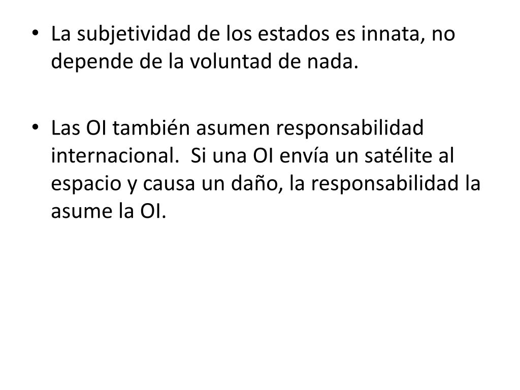 La subjetividad de los estados es innata, no depende de la voluntad de nada. • Las OI también asumen responsabilidad internacional. Si una OI envía un satélite al espacio y causa un daño, la responsabilidad la asume la OI.