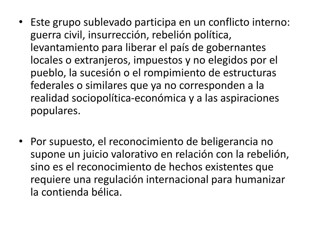 Este grupo sublevado participa en un conflicto interno: guerra civil, insurrección, rebelión política, levantamiento para liberar el país de gobernantes locales o extranjeros, impuestos y no elegidos por el pueblo, la sucesión o el rompimiento de estructuras federales o similares que ya no corresponden a la realidad sociopolítica-económica y a las aspiraciones populares. • Por supuesto, el reconocimiento de beligerancia no supone un juicio valorativo en relación con la rebelión, sino es el reconocimiento de hechos existentes que requiere una regulación internacional para humanizar la contienda bélica.