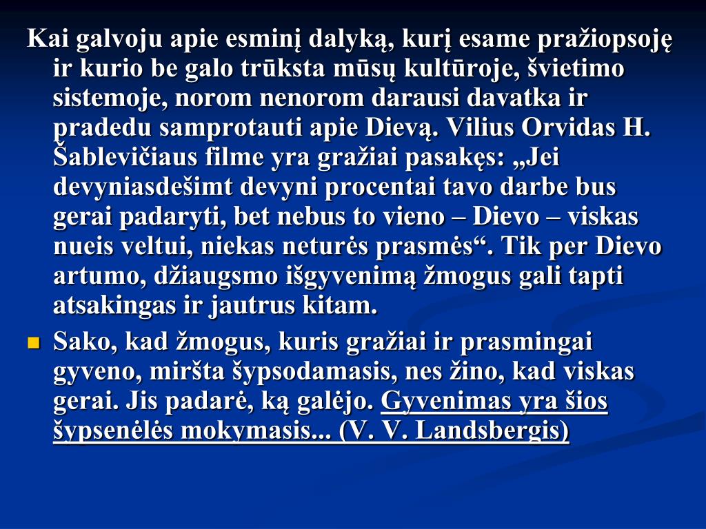 Kai galvoju apie esminį dalyką, kurį esame pražiopsoję ir kurio be galo trūksta mūsų kultūroje, švietimo sistemoje, norom nenorom darausi davatka ir pradedu samprotauti apie Dievą. Vilius Orvidas H. Šablevičiaus filme yra gražiai pasakęs: „Jei devyniasdešimt devyni procentai tavo darbe bus gerai padaryti, bet nebus to vieno – Dievo – viskas nueis veltui, niekas neturės prasmės“. Tik per Dievo artumo, džiaugsmo išgyvenimą žmogus gali tapti atsakingas ir jautrus kitam. • Sako, kad žmogus, kuris gražiai ir prasmingai gyveno, miršta šypsodamasis, nes žino, kad viskas gerai. Jis padarė, ką galėjo. Gyvenimas yra šios šypsenėlės mokymasis... (V. V. Landsbergis)