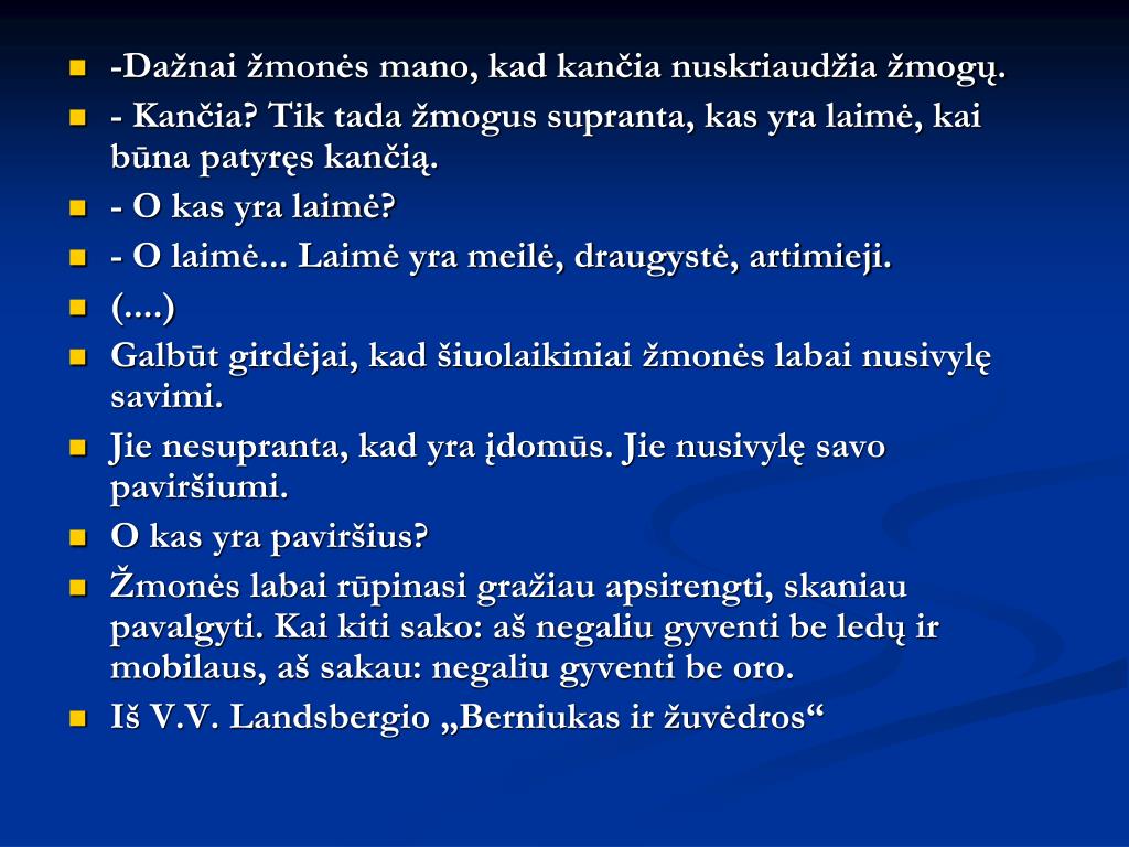 -Dažnai žmonės mano, kad kančia nuskriaudžia žmogų. • - Kančia? Tik tada žmogus supranta, kas yra laimė, kai būna patyręs kančią. • - O kas yra laimė? • - O laimė... Laimė yra meilė, draugystė, artimieji. • (....) • Galbūt girdėjai, kad šiuolaikiniai žmonės labai nusivylę savimi. • Jie nesupranta, kad yra įdomūs. Jie nusivylę savo paviršiumi. • O kas yra paviršius? • Žmonės labai rūpinasi gražiau apsirengti, skaniau pavalgyti. Kai kiti sako: aš negaliu gyventi be ledų ir mobilaus, aš sakau: negaliu gyventi be oro. • Iš V.V. Landsbergio „Berniukas ir žuvėdros“