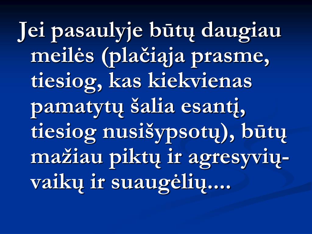 Jei pasaulyje būtų daugiau meilės (plačiąja prasme, tiesiog, kas kiekvienas pamatytų šalia esantį, tiesiog nusišypsotų), būtų mažiau piktų ir agresyvių- vaikų ir suaugėlių....