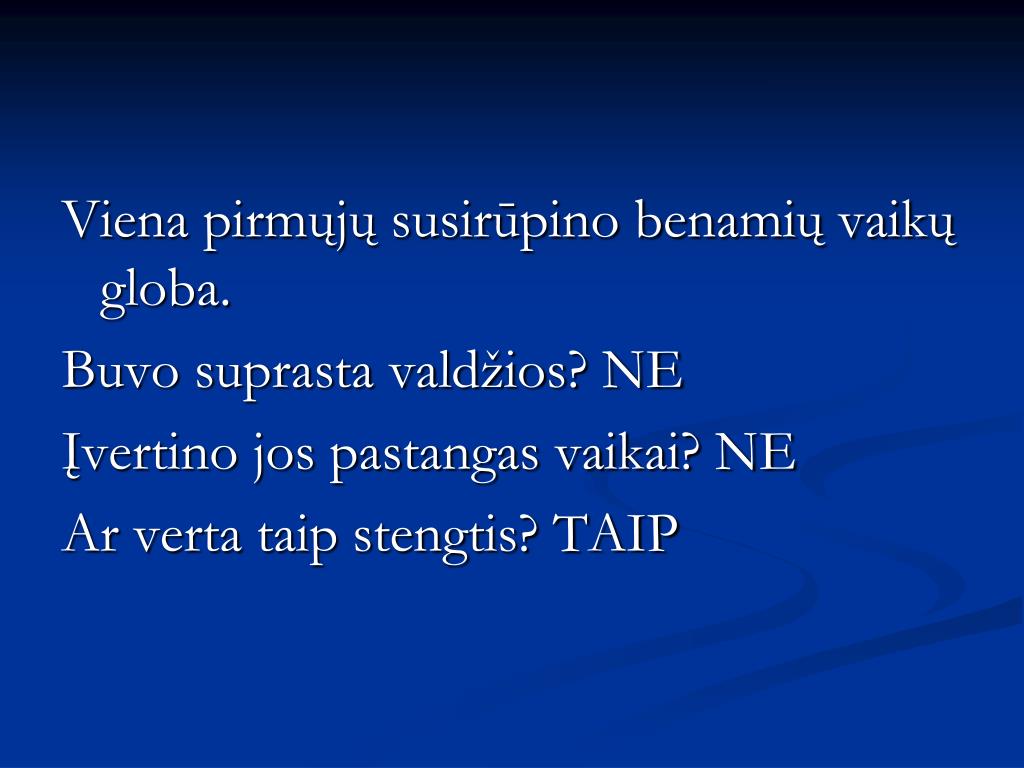 Viena pirmųjų susirūpino benamių vaikų globa. Buvo suprasta valdžios? NE Įvertino jos pastangas vaikai? NE Ar verta taip stengtis? TAIP