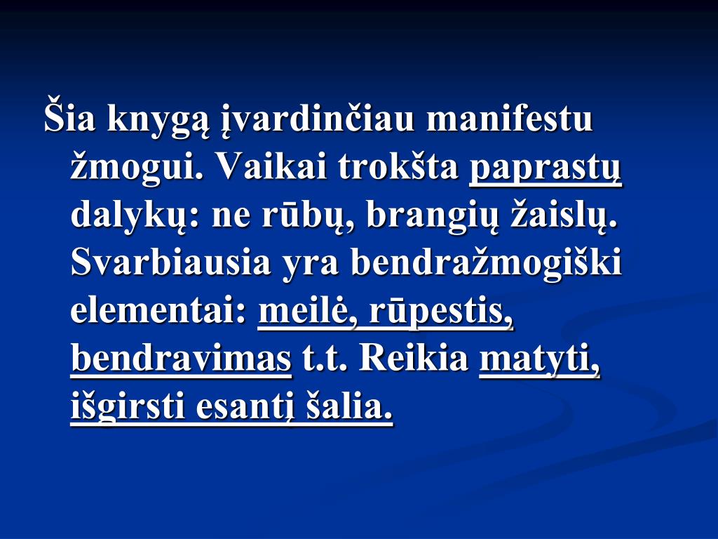 Šia knygą įvardinčiau manifestu žmogui. Vaikai trokšta paprastų dalykų: ne rūbų, brangių žaislų. Svarbiausia yra bendražmogiški elementai: meilė, rūpestis, bendravimas t.t. Reikia matyti, išgirsti esantį šalia.