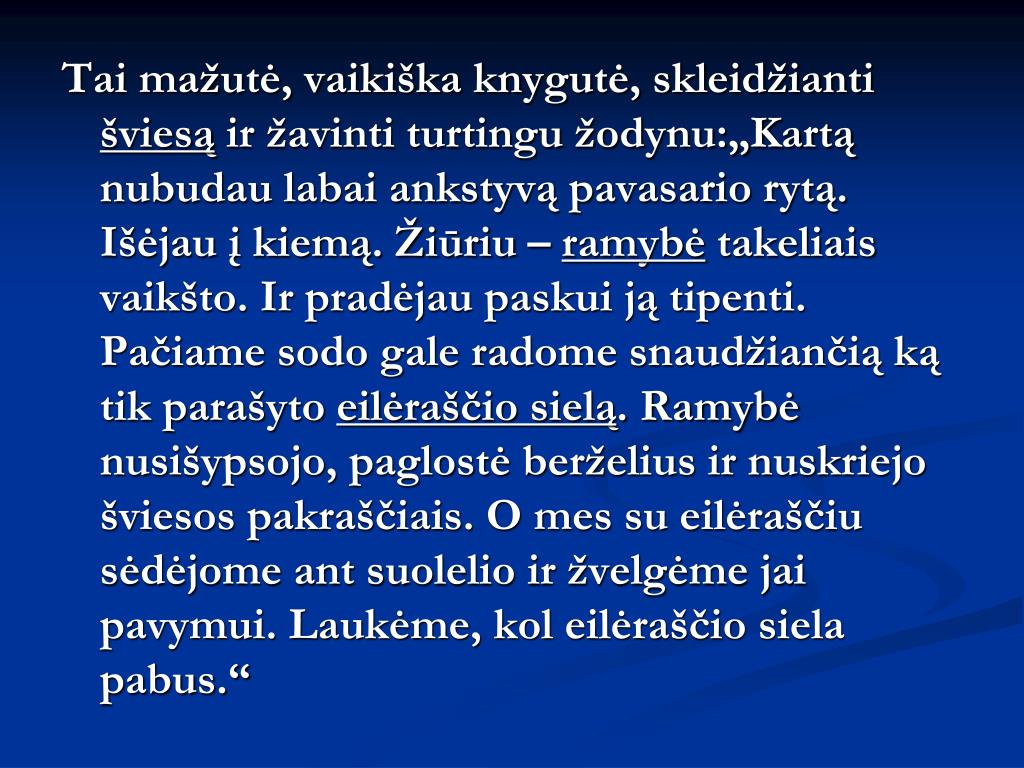Tai mažutė, vaikiška knygutė, skleidžianti šviesą ir žavinti turtingu žodynu:„Kartą nubudau labai ankstyvą pavasario rytą. Išėjau į kiemą. Žiūriu – ramybė takeliais vaikšto. Ir pradėjau paskui ją tipenti. Pačiame sodo gale radome snaudžiančią ką tik parašyto eilėraščio sielą. Ramybė nusišypsojo, paglostė berželius ir nuskriejo šviesos pakraščiais. O mes su eilėraščiu sėdėjome ant suolelio ir žvelgėme jai pavymui. Laukėme, kol eilėraščio siela pabus.“