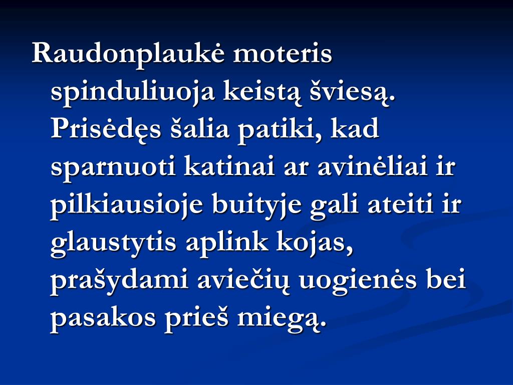 Raudonplaukė moteris spinduliuoja keistą šviesą. Prisėdęs šalia patiki, kad sparnuoti katinai ar avinėliai ir pilkiausioje buityje gali ateiti ir glaustytis aplink kojas, prašydami aviečių uogienės bei pasakos prieš miegą.