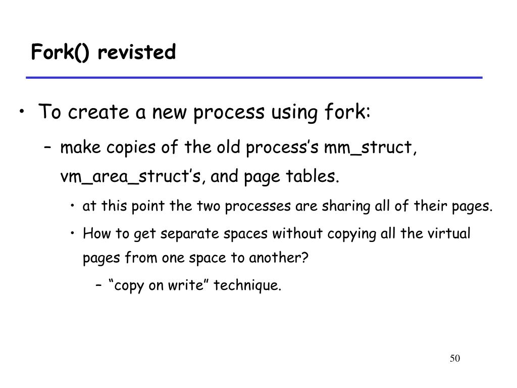 Fork() revisted • To create a new process using fork: • make copies of the old process’s mm_struct, vm_area_struct’s, and page tables. • at this point the two processes are sharing all of their pages. • How to get separate spaces without copying all the virtual pages from one space to another? • “copy on write” technique.