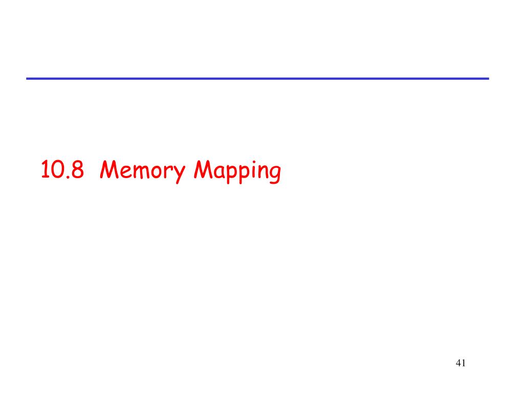 User-level memory mapping P728 • void *mmap(void *start, int len, int prot, int flags, int fd, int offset) • map len bytes starting at offset offsetof the file specified by file description fd, preferably at address start (usually 0 for don’t care). • prot: MAP_READ, MAP_WRITE • flags: MAP_PRIVATE, MAP_SHARED • return a pointer to the mapped area. • Example: fast file copy • useful for applications like Web servers that need to quickly copy files. • mmap allows file transfers without copying into user space.