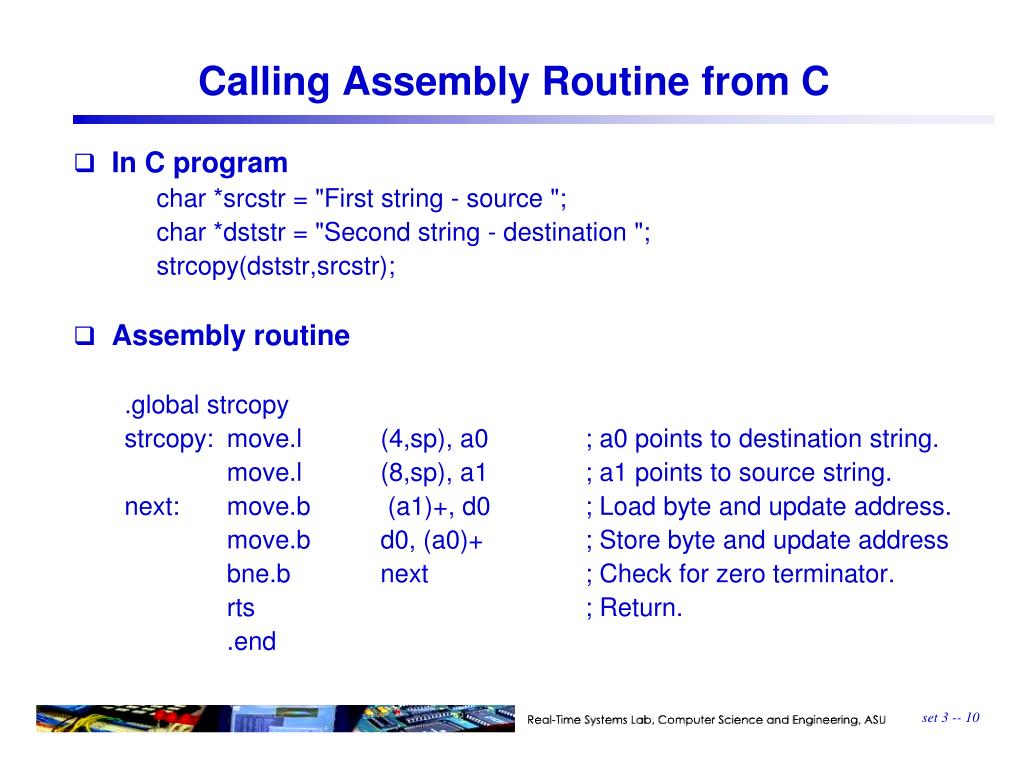 Calling Assembly Routine from C • In C program char *srcstr = "First string - source "; char *dststr = "Second string - destination "; strcopy(dststr,srcstr); • Assembly routine .global strcopy strcopy: move.l (4,sp), a0 ; a0 points to destination string. move.l (8,sp), a1 ; a1 points to source string. next: move.b (a1)+, d0 ; Load byte and update address. move.b d0, (a0)+ ; Store byte and update address bne.b next ; Check for zero terminator. rts ; Return. .end