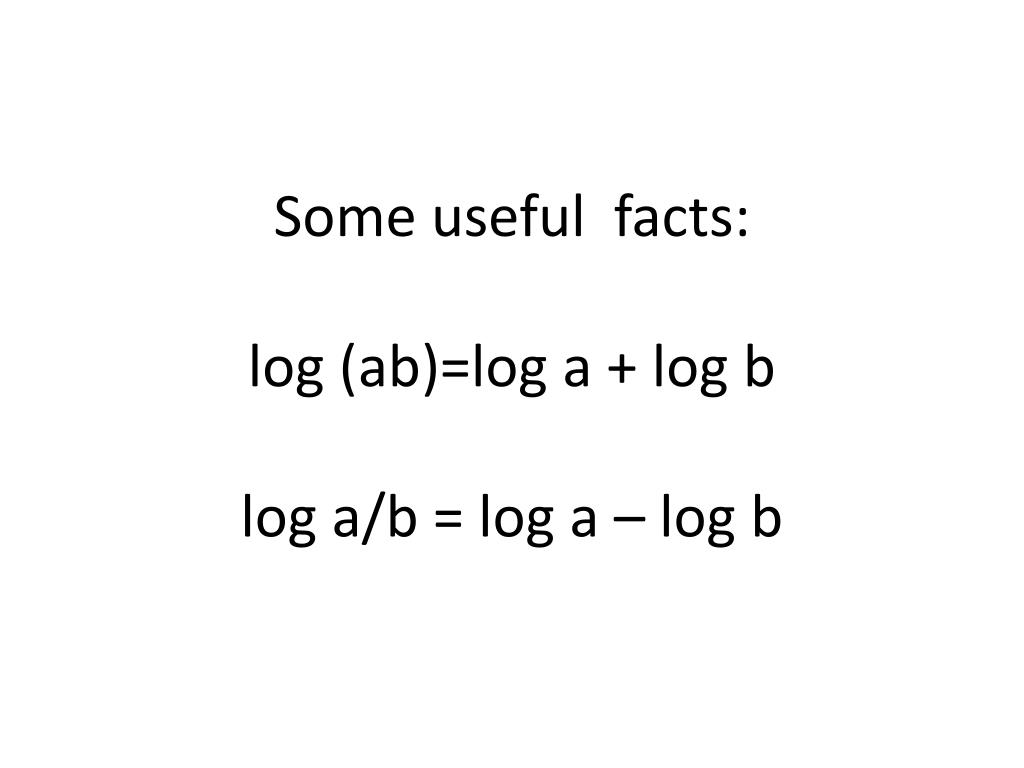 Some useful facts:log (ab)=log a + log blog a/b = log a – log b