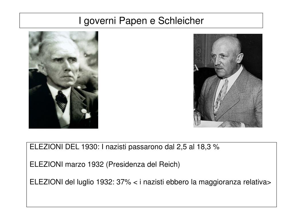 I governi Papen e Schleicher ELEZIONI DEL 1930: I nazisti passarono dal 2,5 al 18,3 % ELEZIONI marzo 1932 (Presidenza del Reich) ELEZIONI del luglio 1932: 37% < i nazisti ebbero la maggioranza relativa>