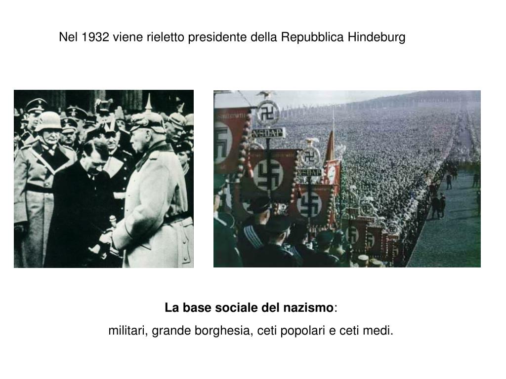 Nel 1932 viene rieletto presidente della Repubblica Hindeburg La base sociale del nazismo: militari, grande borghesia, ceti popolari e ceti medi.