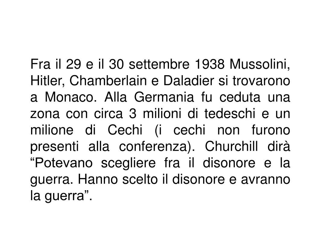 Fra il 29 e il 30 settembre 1938 Mussolini, Hitler, Chamberlain e Daladier si trovarono a Monaco. Alla Germania fu ceduta una zona con circa 3 milioni di tedeschi e un milione di Cechi (i cechi non furono presenti alla conferenza). Churchill dirà “Potevano scegliere fra il disonore e la guerra. Hanno scelto il disonore e avranno la guerra”.