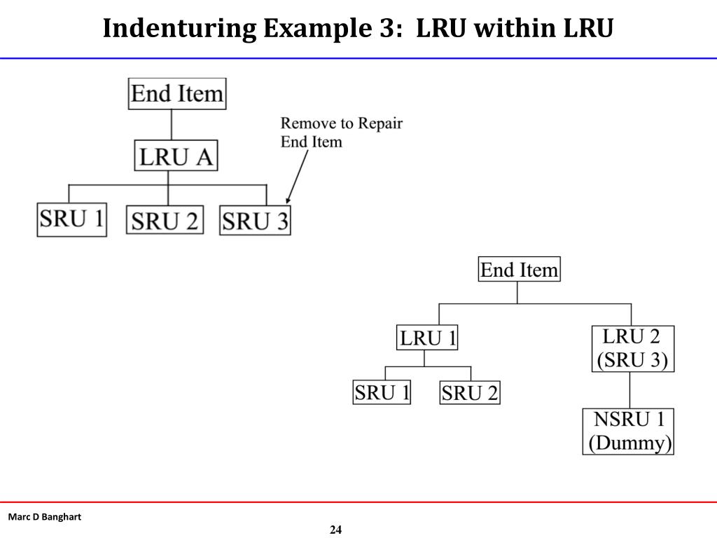 Important Definitions • End Item • Highest level of Indenture • System, an end item, a major assembly of an item, or an item itself • LRU/NLRU • LRU removed and replaced • Restores end item to operationally ready condition • Directly from the end item • SRU/NSRU • SRUs are items that are part of an LRU • SRU will repair the failed LRU • SRU repair is off-equipment maintenance