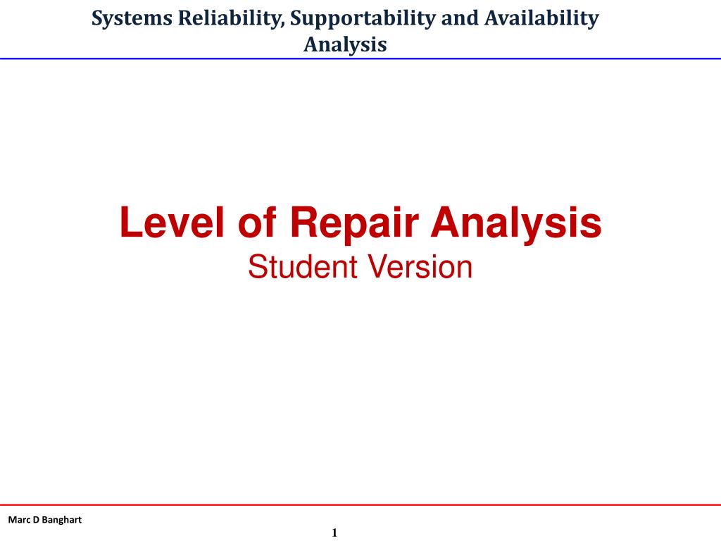 Systems Reliability, Supportability and Availability Analysis. Level of Repair Analysis Student Version. Introduction. Level of Repair Analysis utilized to develop support concept of system during acquisition process Complex system with thousands of assemblies, sub-assemblies, components, etc.