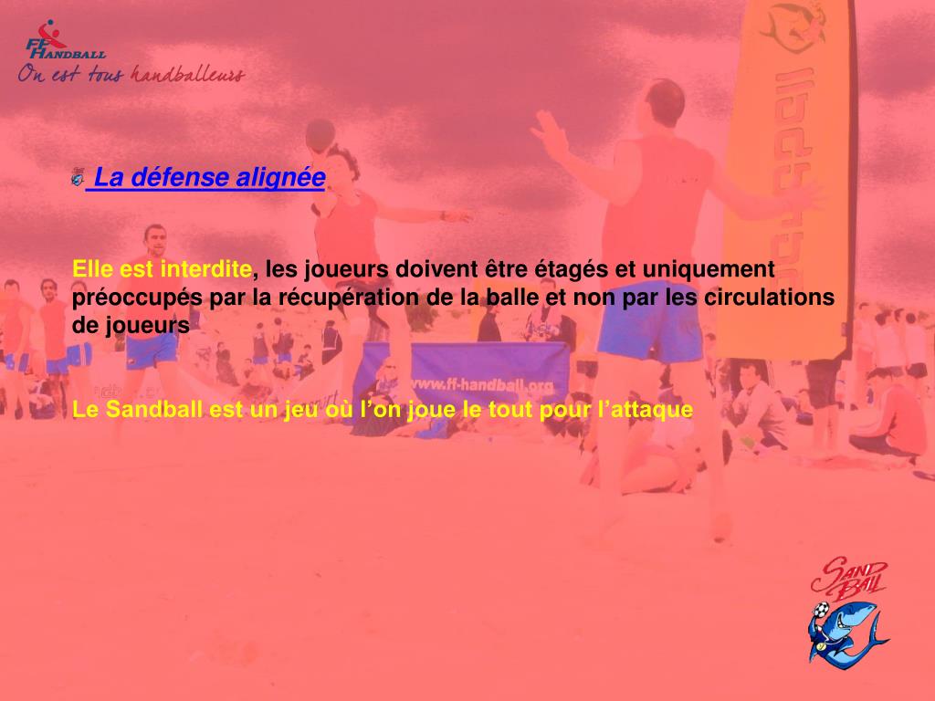 La défense alignéeElle est interdite, les joueurs doivent être étagés et uniquement préoccupés par la récupération de la balle et non par les circulations de joueurs Le Sandball est un jeu où l’on joue le tout pour l’attaque