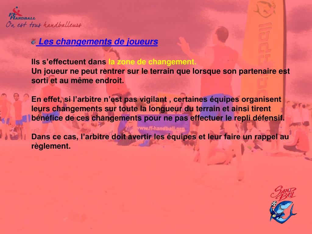 Les changements de joueursIls s’effectuent dans la zone de changement.Un joueur ne peut rentrer sur le terrain que lorsque son partenaire est sorti et au même endroit.En effet, si l’arbitre n’est pas vigilant , certaines équipes organisent leurs changements sur toute la longueur du terrain et ainsi tirent bénéfice de ces changements pour ne pas effectuer le repli défensif.Dans ce cas, l’arbitre doit avertir les équipes et leur faire un rappel au règlement.